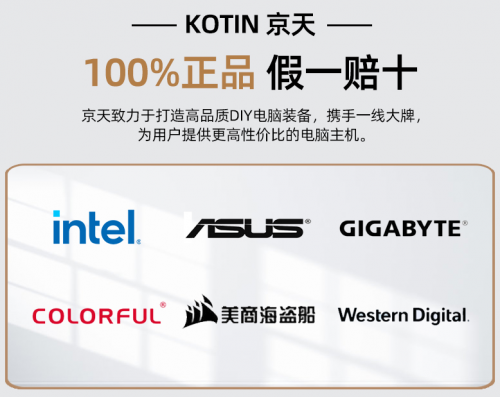 在货品供应上,精选大牌品质硬件提供稳定保障,京天华盛携手联合英特尔、英伟达、七彩虹、华硕、技嘉、西部数据、镁光、金河田、长城、冠捷、三星等各大品牌深度合作,京天华盛充分整合资源,为玩家提供更优性价比的DIY电脑装备。